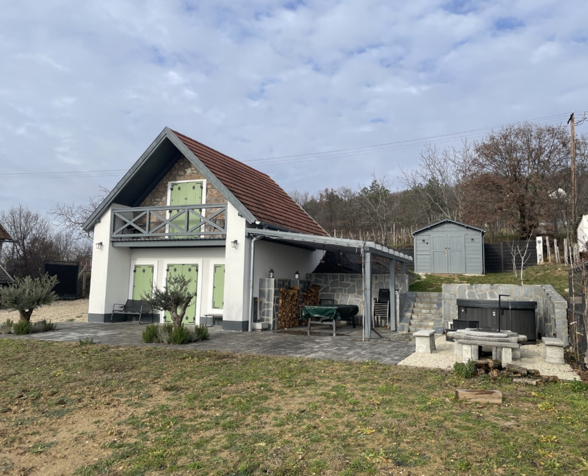 A ház mellett kialakított exkluzív kerti pihenőtér a nyári esték tökéletes helyszíne: fedett terasz, fatüzelésű dézsa jakuzzi funkcióval, valamint hangulatos Jován XXL tűzrakóhely szolgálja a kikapcsolódást. A kertben egy 9 m²-es szerszámos ház is helyet kapott.