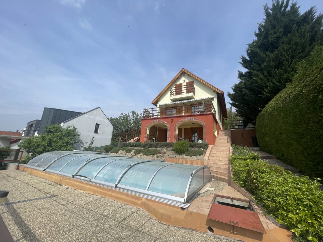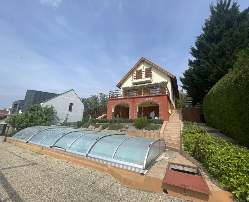 A két nagyméretű, panorámás terasz (22 m2 és 16 m2) valódi kiterjesztése a lakótérnek – reggeli kávéhoz, esti borozáshoz, vagy egyszerűen a látványhoz. A kertben egy 8×4 méteres, fedéssel ellátott medence kapott helyet, amely tovább emeli az ingatlan nyaralóhangulatát.