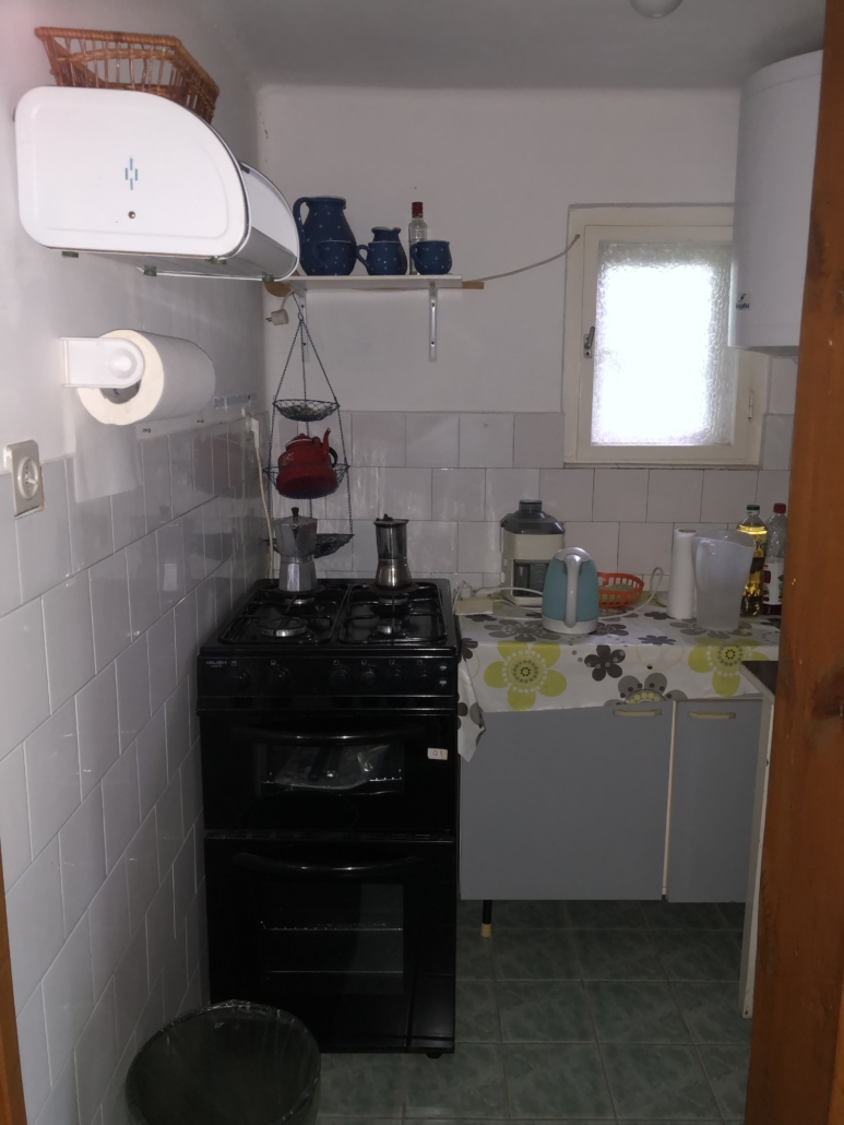 Közművek: vezetékes víz, villany, csatorna telken belül (jelenleg emésztőbe kötve).